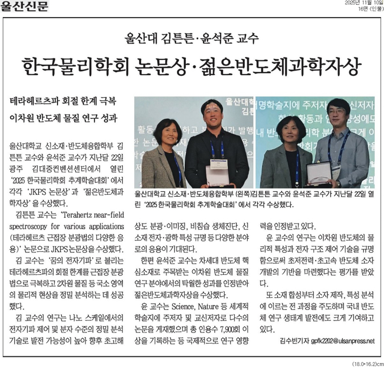 지난 22일 김대중컨벤션센터에서 열린 2025 한국물리학회 추계학술대회에서 울산대 나노반도체공학전공 김튼튼 교수가 KPS 논문상, 윤석준 교수가 반도체젊은과학자상을 수상했다.