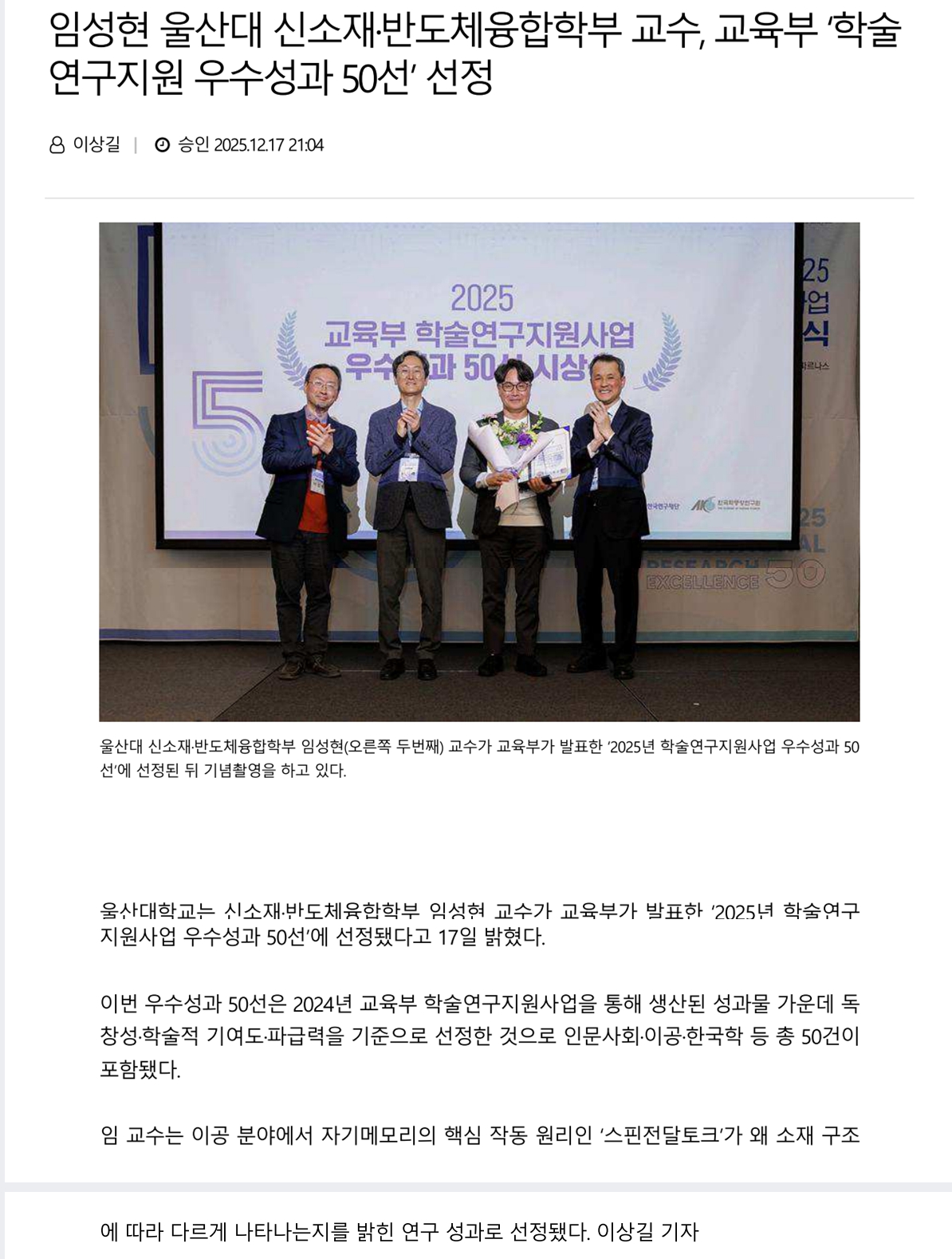 임성현 울산대 신소재 반도체융합학부 교수 교육부 학술연구지원 우수성과 50선 선정